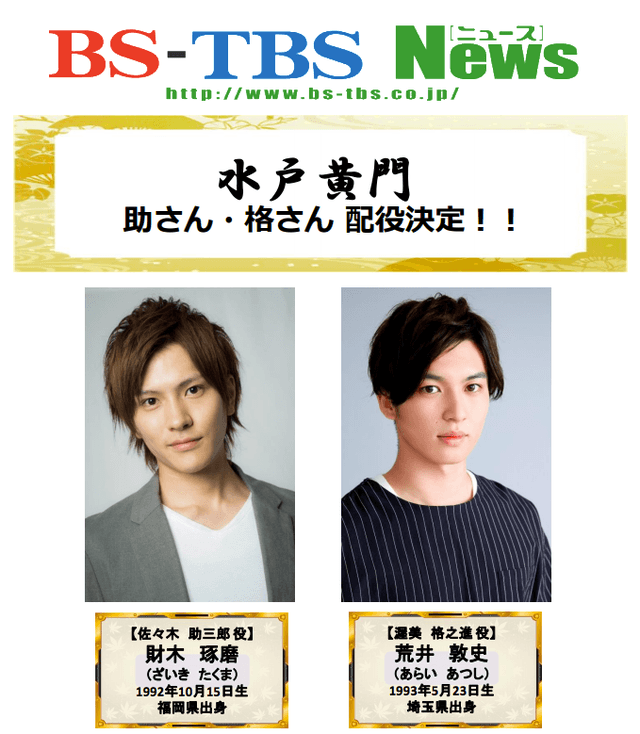 10月よりBS-TBSにて放送される『水戸黄門』の助さん、格さんのキャストが発表されました。