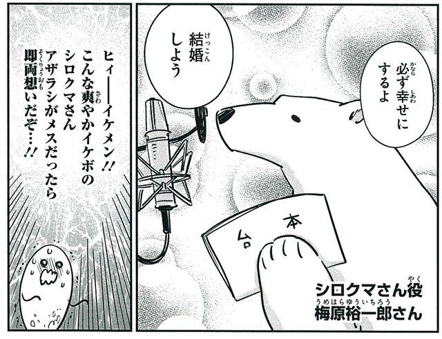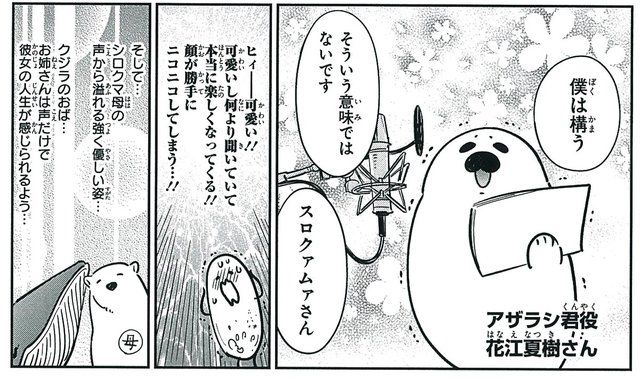 こういう作者のアフレコ体験レポって基本的に声優の美化されたイラストでやってるところが多いのにシロクマとアザラシのまんまなのが面白いしそれなのに全部「わかる」って頷いちゃいそうだった。