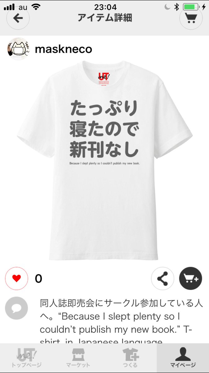 ユニクロのオリジナルTシャツが作れるサービス「UTme! 」を利用して制作されたアイテムには、「ほんにん」「てつだい」「たっぷり寝たので新刊なし」という文字が全面にプリント。