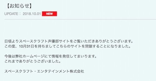 サイトは10月31日をもって閉鎖。あわせて声優部のグッズも10月31日17:00をもって販売終了となります。これからはスペースクラフトのホームページにて情報を発信されます。