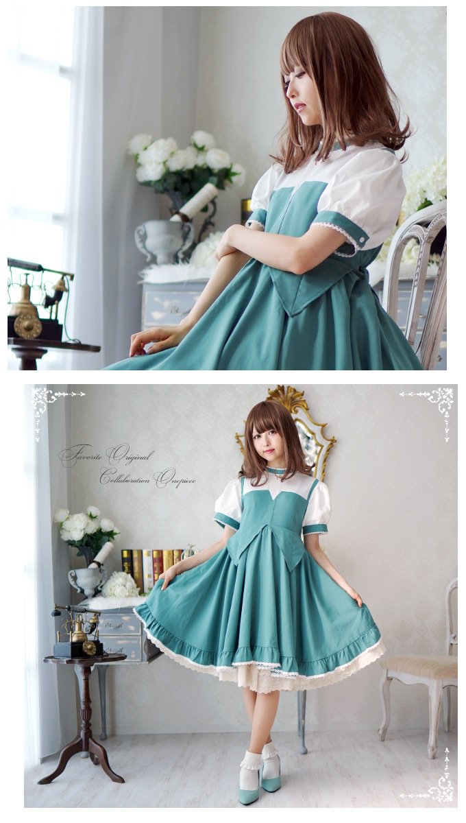 カフェミュウミュウのウェイトレス風エプロン付きパフスリーブワンピース